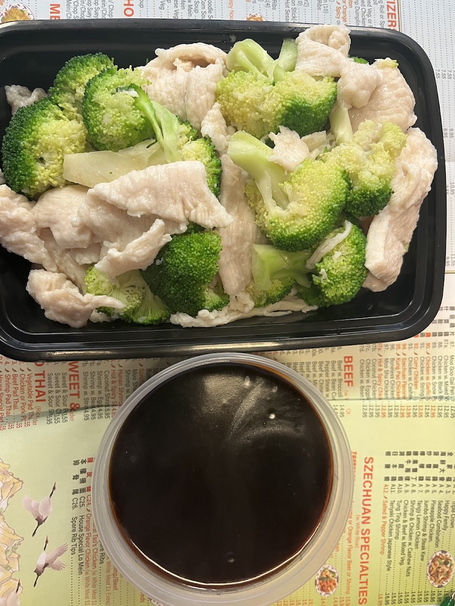 Served without sugar, salt, corn starch, M.S.G. with brown sauce or garlic sauce on the side. Served with white or brown rice. Weight watcher.